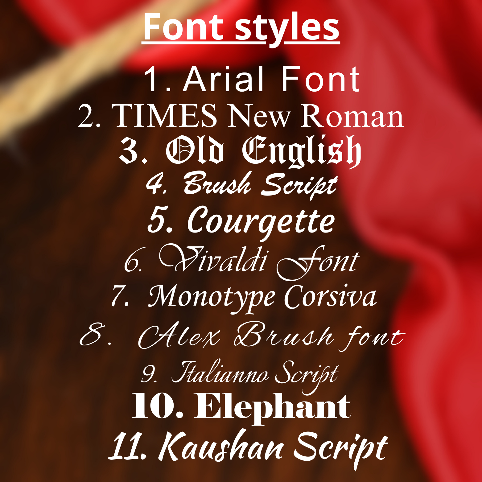 Wählen Sie aus unseren verfügbaren Schriftarten für Ihre Ringgravur. Geben Sie den Namen der Schriftart in das Gravurfeld auf der Produktseite ein, bevor Sie Ihre Bestellung aufgeben. Wenn Sie keine Schriftart auswählen, verwenden wir die Standardschriftart 'Arial'. Wenn Sie eine andere Schriftart bevorzugen, die nicht in der Liste enthalten ist, hinterlassen Sie uns bitte eine Nachricht mit dem Namen der Schriftart.