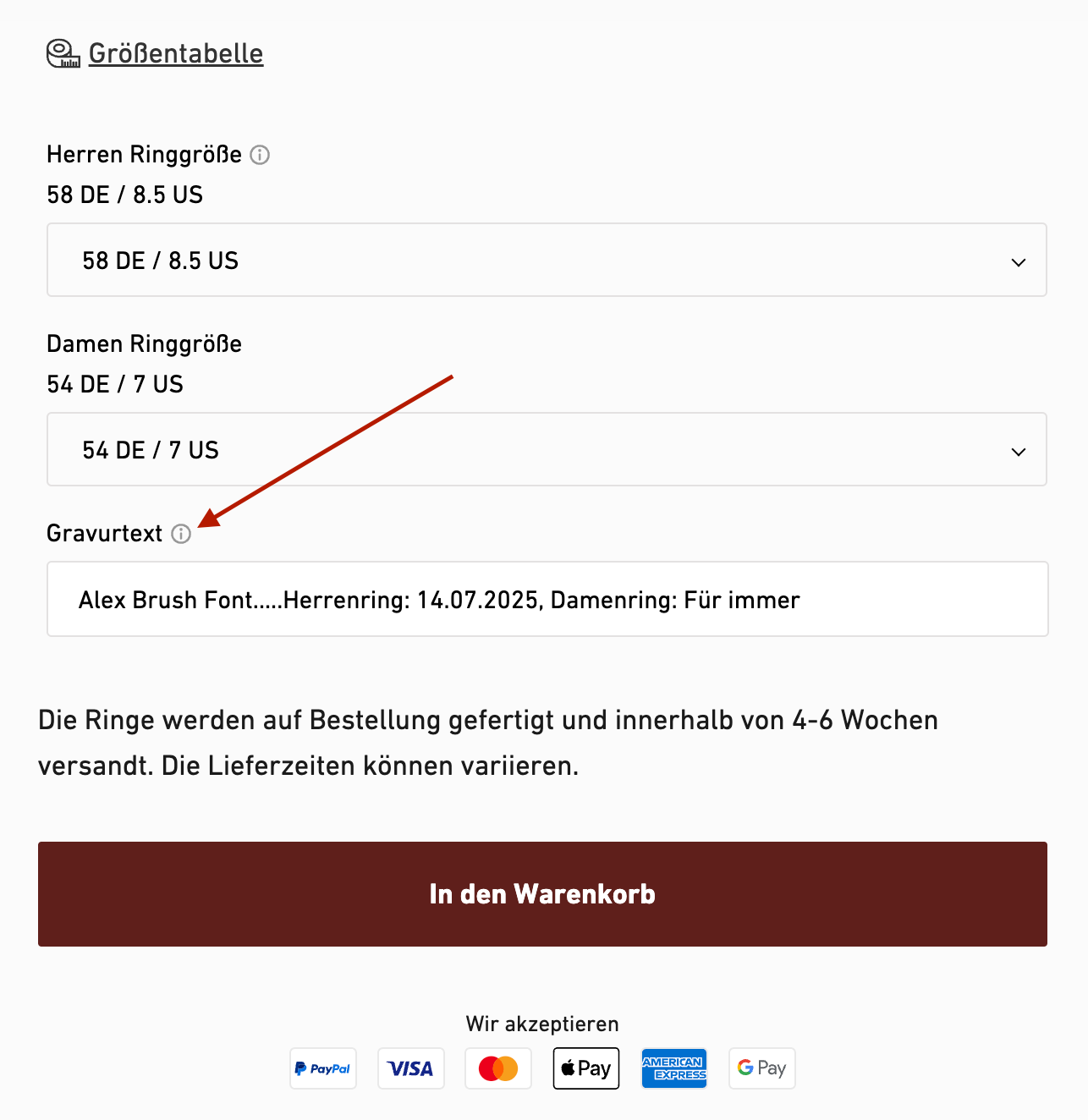 Sobald Sie Ihre Ringgrößen ausgewählt haben, geben Sie Ihre Gravurdetails in das Textfeld 'Gravur' ein. Geben Sie zunächst die gewünschte Schriftart an (wenn Sie keine Schriftart auswählen, verwenden wir die Schriftart 'Arial'). Fügen Sie dann Ihren Gravurtext wie in der Abbildung oben ein.