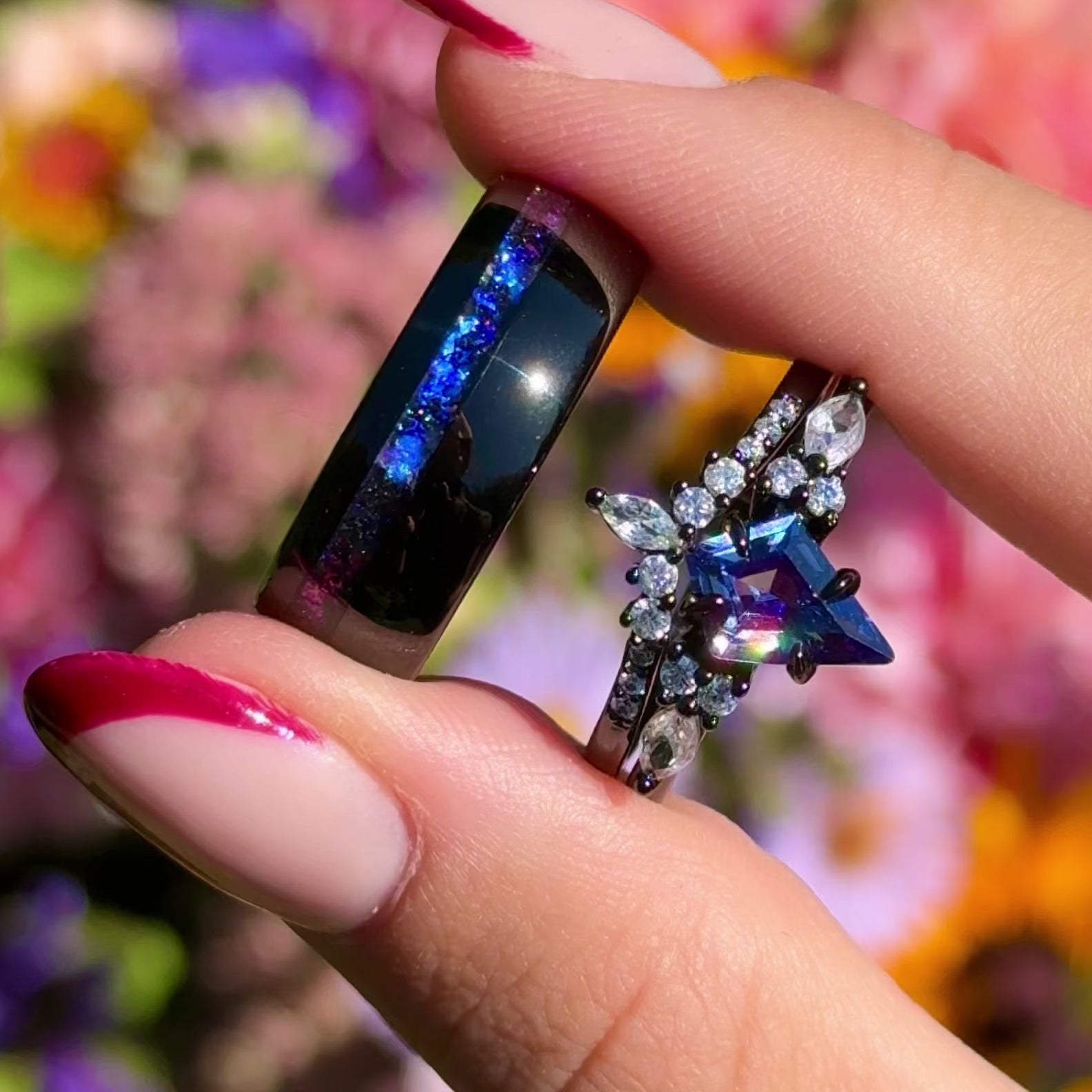 Dieses Paar Ringe wurde für Paare mit großen Träumen entworfen und fängt die Mystik des Kosmos in einem atemberaubenden und langlebigen Design ein. Unsere Nebelringe haben eine auffällige Weltraumintarsie auf einem eleganten schwarzen Band und symbolisieren eine Liebe, die wahrlich nicht von dieser Welt ist.