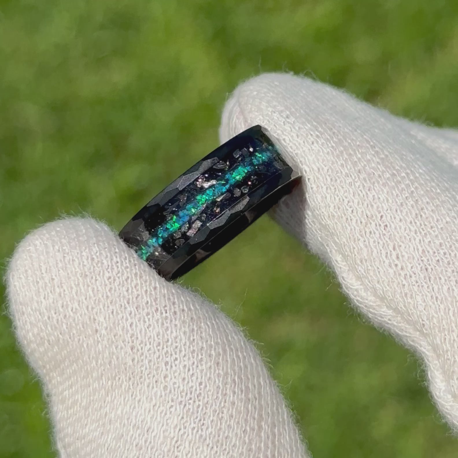 Perfekt für jeden Anlass, ob als Verlobungsring, Ehering oder Verlobungsring. In der Mitte befindet sich eine faszinierende Einlage aus Dinosaurierknochen und Meteoriten, die an die bezaubernden Farbtöne der Aurora Borealis erinnert.