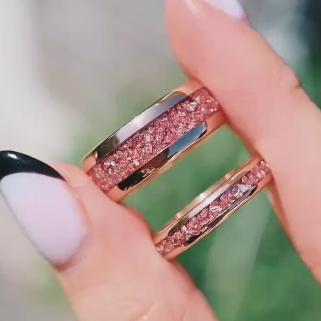 - Sein Ring: Wolfram (14-karätiges Roségold-Vermeil) und Morganit, 8 mm breit