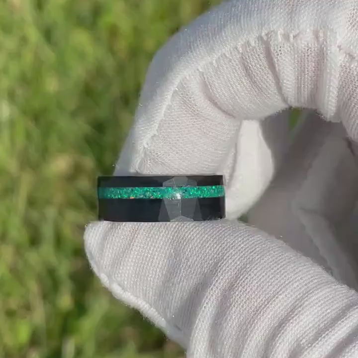Enigma – zerstoßener grüner Opal – eine beeindruckende Mischung aus Mysterium und Faszination. Dieses Ringset für Paare besticht durch die faszinierende Schönheit zerstoßenen grünen Opals, der die rätselhafte und tiefe Verbindung zwischen Ihnen symbolisiert.