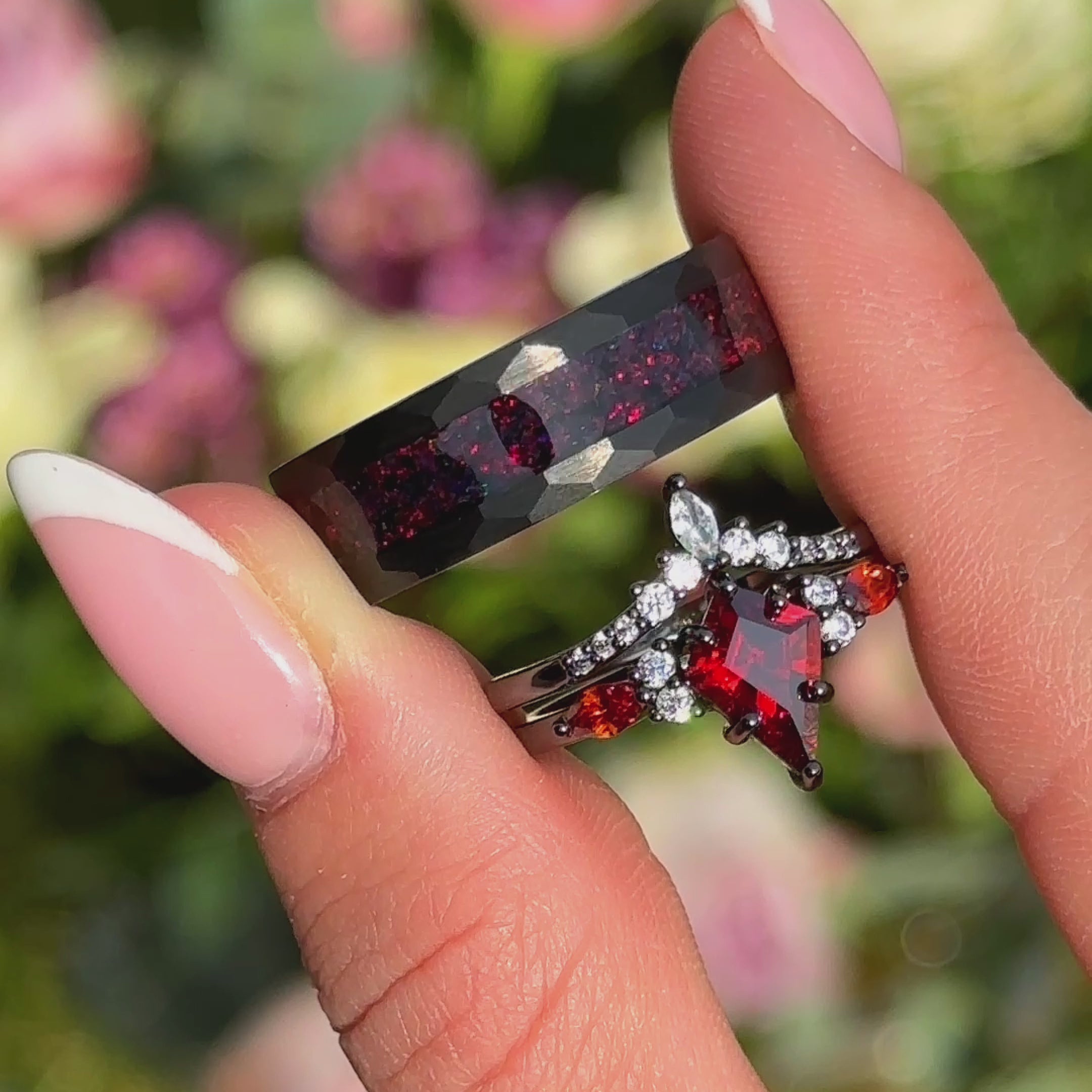 - Sein Ring: Wolfram (Schwarz plattiert) und Inlay aus zerstoßenem rotem Feueropal