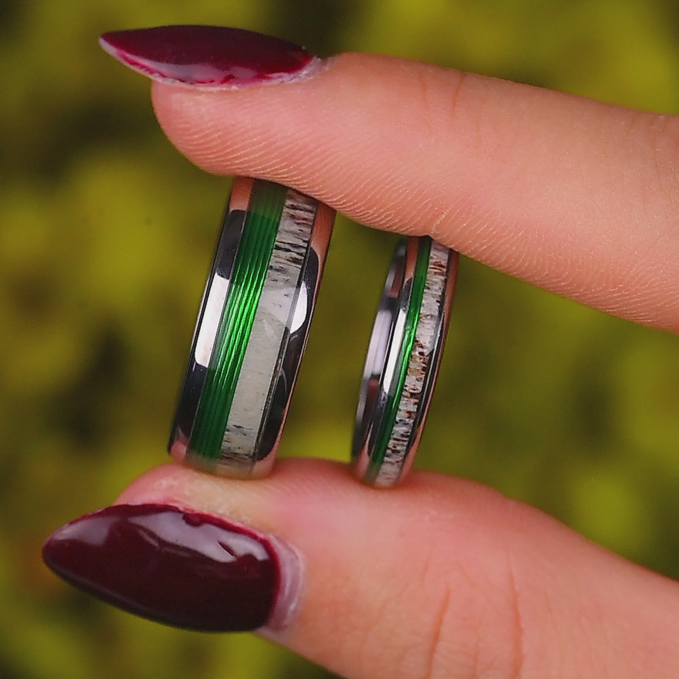 The Horizont – Set aus Ringen aus grüner Angelschnur und Hirschgeweih – eine bemerkenswerte Verschmelzung von natürlicher Schönheit und Outdoor-Geist. Dieses Ringset verfügt über eine leuchtend grüne Angelschnureinlage gepaart mit der rauen Eleganz von Hirschgeweih und fängt die Essenz von Abenteuer und Natur ein.