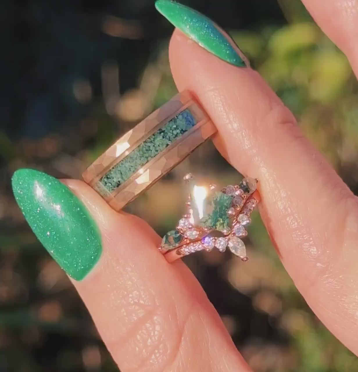 Feiere eure Liebe mit der erdenden Schönheit des Moosachats – ein Stein, der für seine tiefe Verbindung zur Natur und sein emotionales Gleichgewicht geschätzt wird. Jeder Moosachat ist ein echtes Unikat, mit zarten grünen Einschlüssen, die an kleine Landschaften oder moosbedeckte Wälder erinnern – ein Symbol für Wachstum, Erneuerung und eine starke gemeinsame Basis.