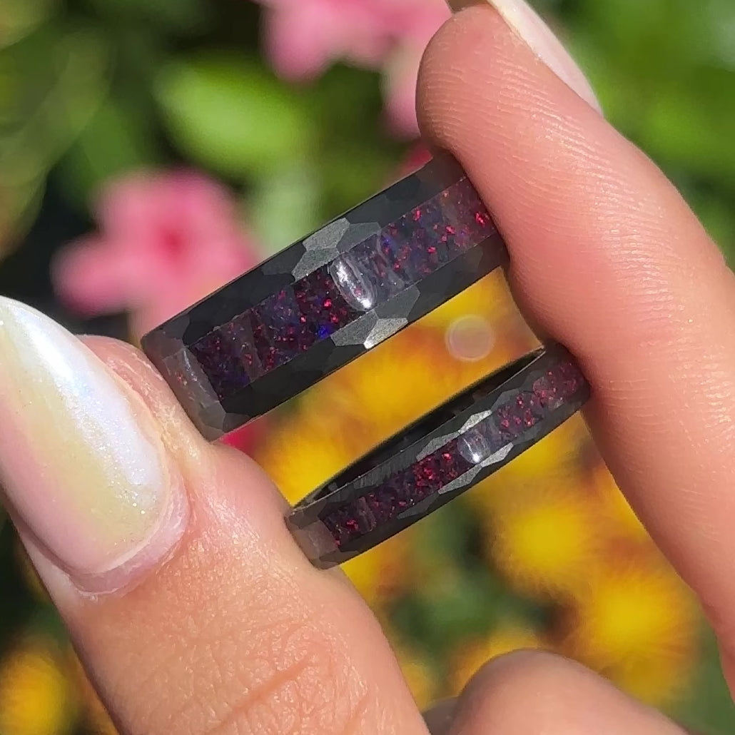 Erheben Sie sich mit dem Phoenix . Der Phoenix ist ein Paarring-Set, das für Paare entworfen wurde, die an Herausforderungen wachsen und Widerstandskraft und Wandlungsfähigkeit verkörpern. Dieser auffällige Ring verfügt über eine bezaubernde Einlage aus zerstoßenem rotem Feueropal auf einem kräftigen schwarzen gehämmerten Band.