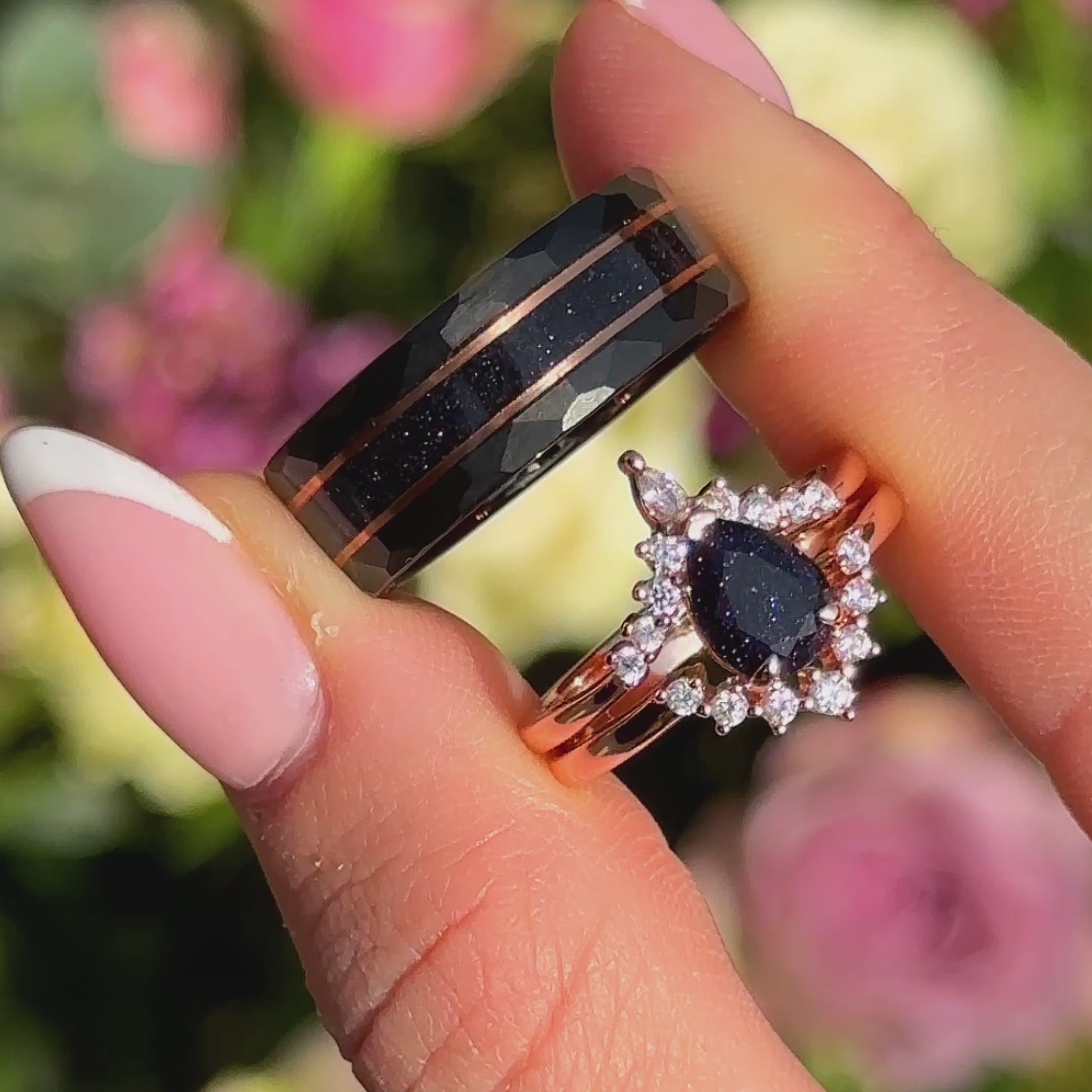 - Sein Ring: Schwarz Wolfram (14-karätiges Roségold-Vermeil Streifen) und Sandstein Opal, 8 mm breit