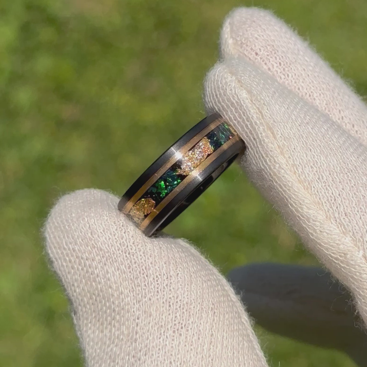 Strahlen Sie Luxus aus mit dem Smaragd. Es ist ein Ehering für Männer, der Eleganz und Opulenz ausstrahlt. Dieser exquisite Ring besteht aus einem gebürsteten schwarzen Wolframband mit doppelten vergoldeten Streifen, die die Einlage aus 24-karätigem Blattgold und smaragdgrünem Opal in der Mitte elegant hervorheben.