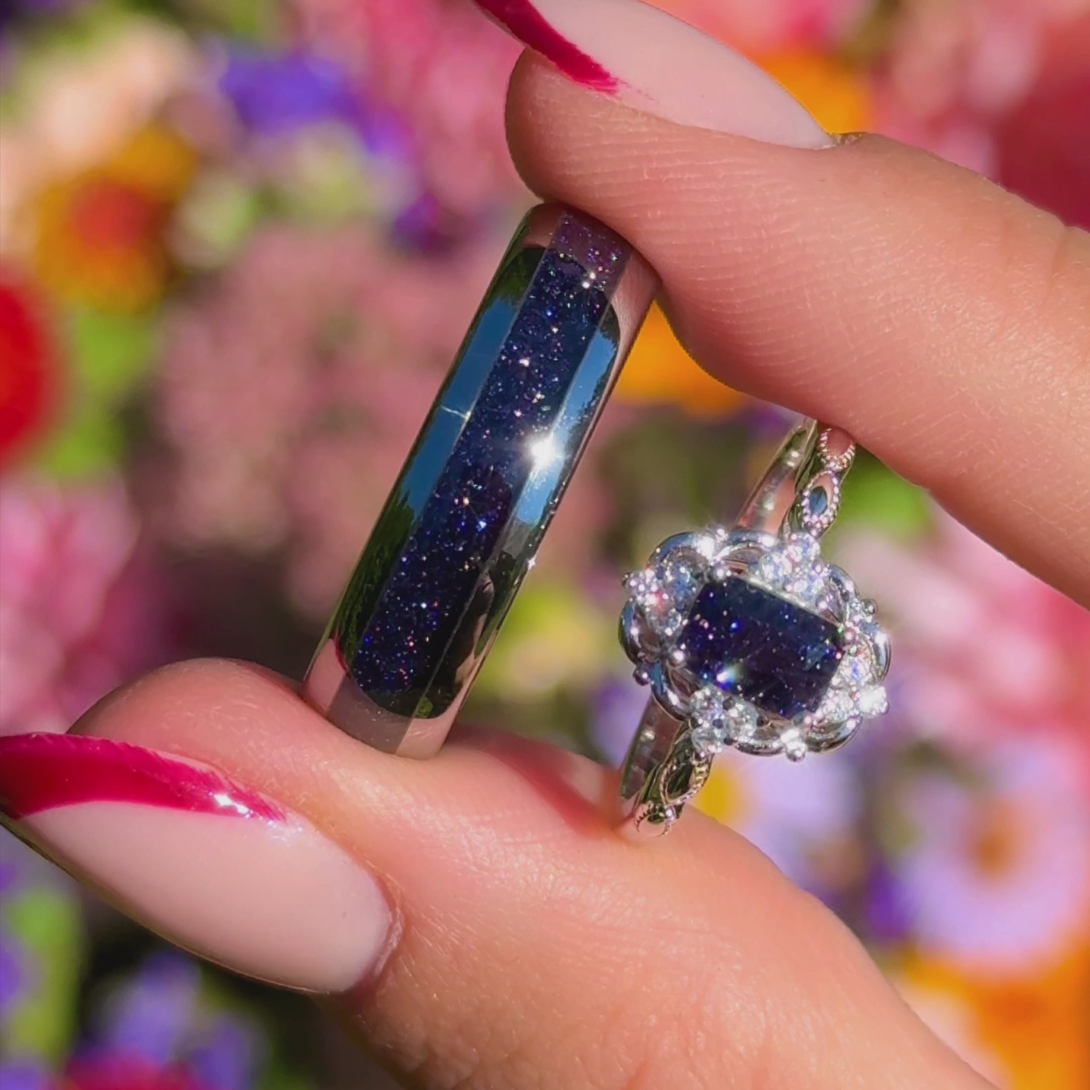 Gemacht für Paare, die nach den Galaxien greifen . Stardust ist ein Paarring-Set , das die ätherische Schönheit des Kosmos einfängt. Dieser auffällige Ring verfügt über eine faszinierende Nebeleinlage auf einem eleganten schwarzen Band.