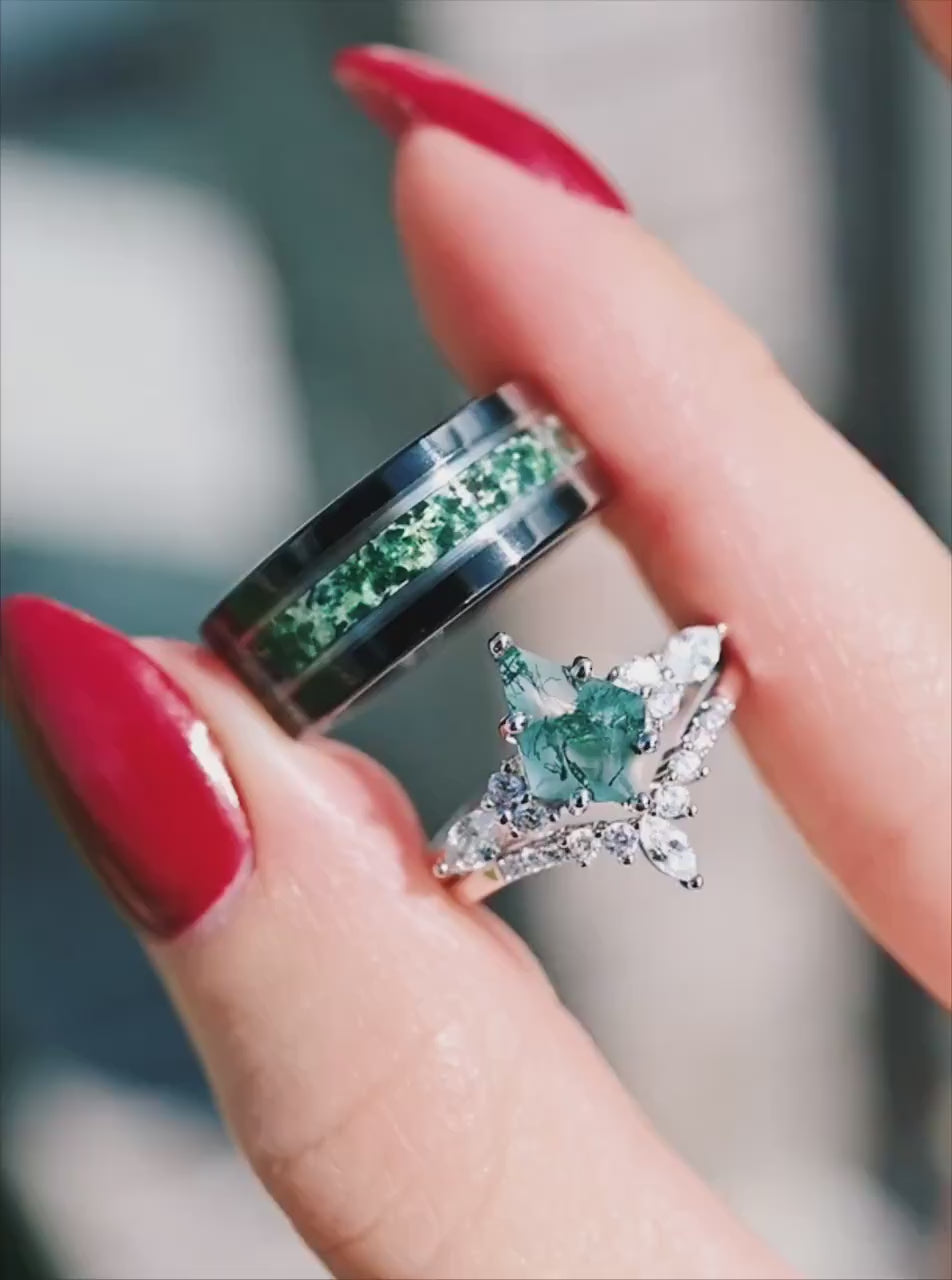 Feiert eure zeitlose Verbindung mit dem Grünen Gelöbnis von Elysia, einem Paar-Ring-Set aus grünem Moosachat, inspiriert von antiken Legenden. Die natürlichen, moosartigen Muster in den Steinen erinnern an die üppigen Landschaften des mythischen Elysiums und symbolisieren ewige Liebe, Wachstum und Einheit. Perfekt für Paare, die eine Bindung ehren, die so beständig und lebendig ist wie die Geschichten vergangener Zeiten. Lasst diese Ringe ein ewiges Zeugnis eurer gemeinsamen Geschichte sein, verwurzelt in der Geschichte und erblühend in die Ewigkeit.