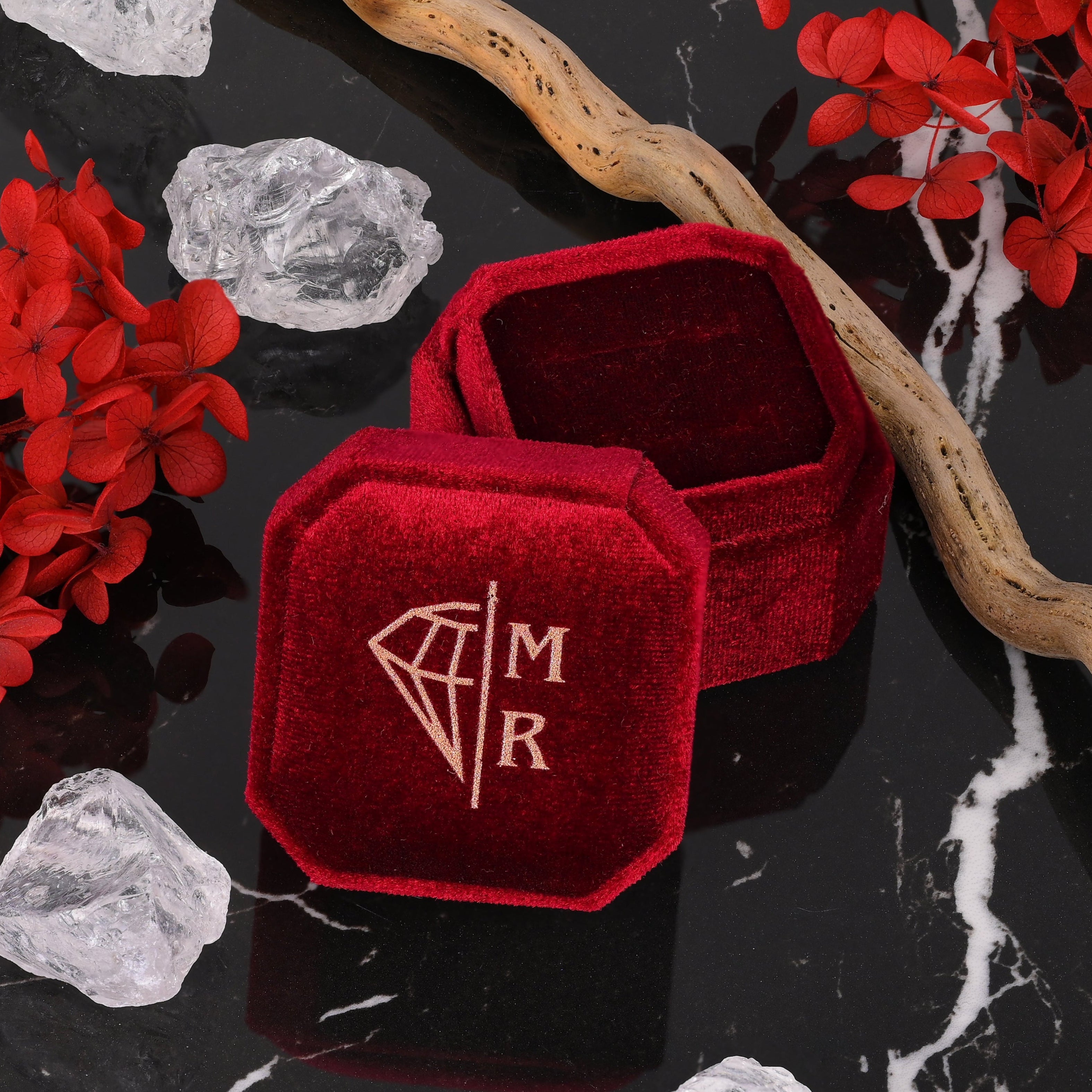 Jedes Ringset wird mit einer eleganten, weinrote Samtboxgeliefert. Ergänzen Sie Ihren Ring-Set-Kauf mit unserer kostenlosen Ringbox, die Sie als Geschenk erhalten - ein zeitloser Hauch von Eleganz, der zu jeder Bestellung passt.